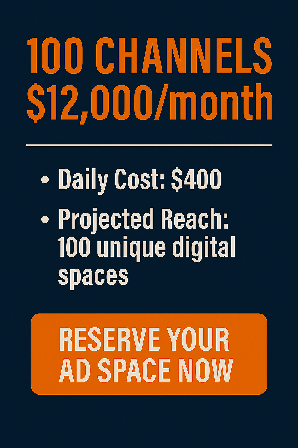 Secure **ad space on 20 premium channels** for **$2,400 per month