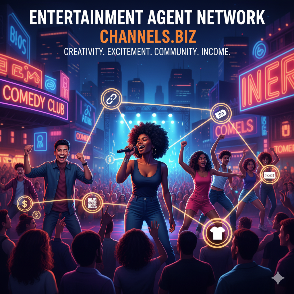 The Entertainment Agent Network on Channels.biz is designed for performers, creators, and event organizers to showcase and monetize their talent. Agents can host live shows, stream music and comedy, promote films, sell event tickets, or manage exclusive fan content. Each member receives a personal affiliate link and unique QR code to grow their audience and increase earnings. Whether it’s concerts, festivals, comedy nights, theater productions, or online entertainment streams, this network turns creativity into recurring income while building strong community engagement.
